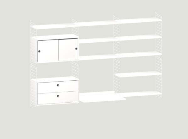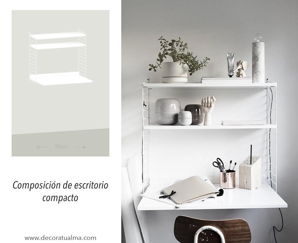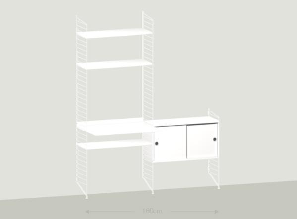 Por último, una composición de escritorio para espacios de trabajo más estrechos. Compuesto por una única columna String con 3 baldas y el sobre del escritorio. Esta versión es un TOP VENTAS en nuestra shop y está disponible para compra rápida con todos los módulos que necesitas ya incluidos (ver aquí).