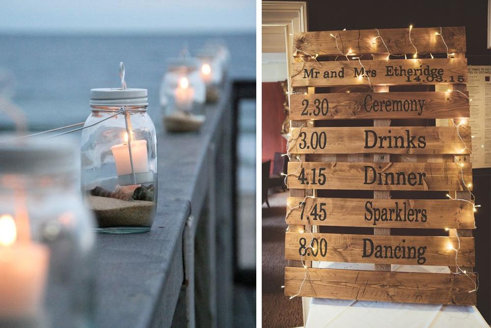Cuando cae el sol nada es tan romántico como una iluminación íntima con velas, alumbra algunas zonas con jarrones de cristal o damajuanas y grandes velas. También quedan genial las luces led cálidas que vienen en tiras con el cable de cobre, puedes ponerlas en árboles, carteles, sombrillas… ¡Crearán una atmósfera mágica!