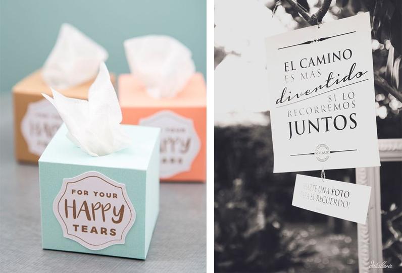 Deja mensajes personalizados en algunos rincones, cuida los detalles. Una nota en la mesa, en el baño, una pizarra con un mensaje de bienvenida, fotos y recuerdos en las mesas… Crea tu historia y compártela con los tuyos. ¡Tu boda es única, haz que se note!