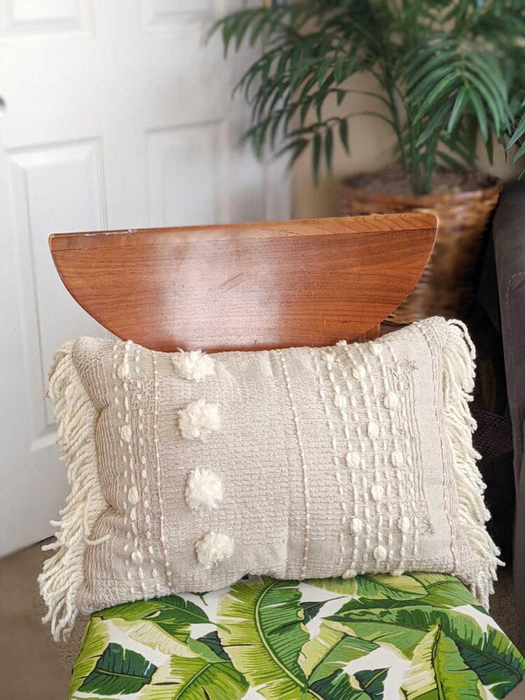 Puedes personalizar tus cojines más sencillos dándoles un toque boho y llamativo. No necesitas demasiado para conseguirlo, de hecho en el DIY que vemos para inspirarnos, ni siquiera han necesitado una funda de cojín, sino que han utilizado unas alfombrillas de baño. Sí, lo habéis leído bien. Si no lo creéis, este es el antes y el después…DIY para personalizar cojines