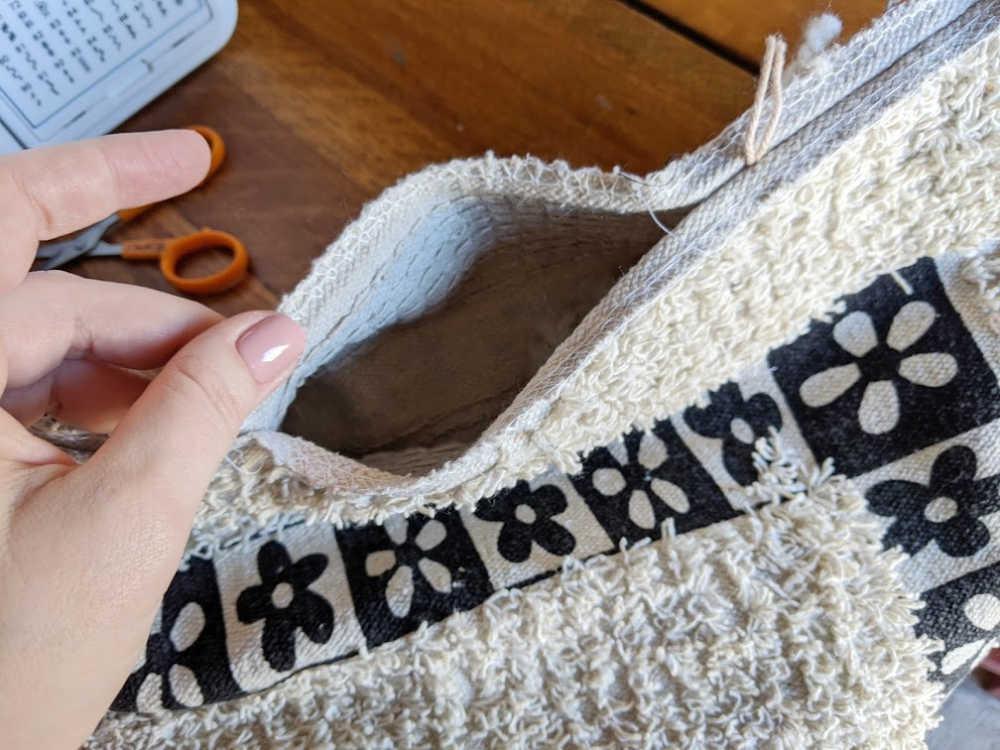 Como decíamos, en este caso se han utilizado alfombrillas de baño que tienen más textura y grosor, pero también se podría conseguir con toallas u otro tipo de textil; para hacerlo igual que en el ejemplo, usaríamos dos piezas.Un truco que nos puede resultar de ayuda que también hicieron aquí, es usar la parte de atrás del textil si tiene algún dibujo o patrón que no queremos que se vea. Necesitamos, eso sí, un relleno para el cojín con el que envolver nuestras telas elegidas.