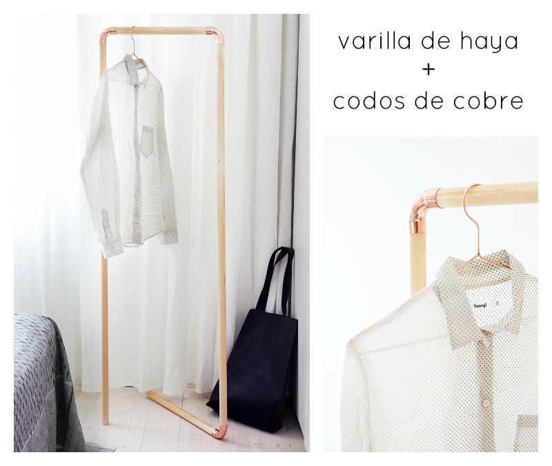 Varillas de madera unidas por codos de noventa grados de cobre, que podéis encontrar en cualquier superficie de bricolaje.
