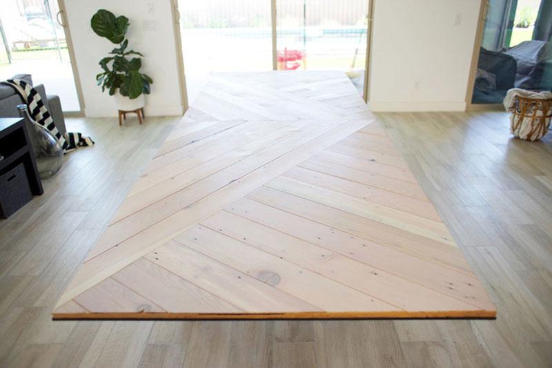 Fuente: Kristi Murphy Busca un lugar adecuado donde puedas trabajar con comodidad. Hazte con dos caballetes y coloca en horizontal el tablero sobre el que vas a pegar las lamas de madera.