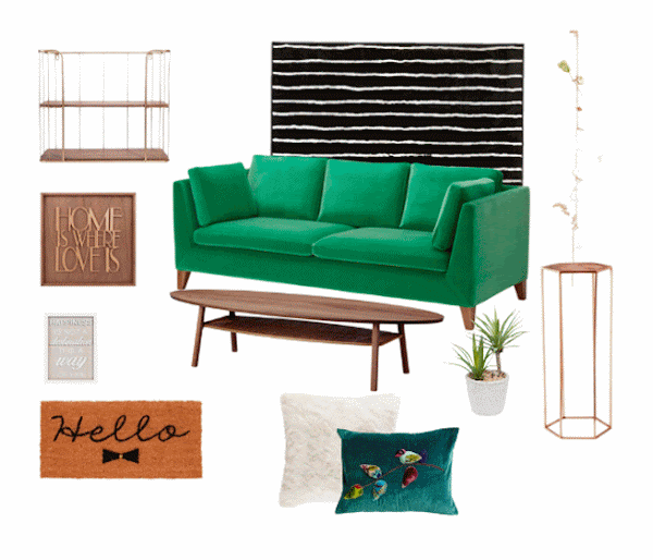 Sofá 3 plazas/ cojín terciopelo, verde turquesa/ cojín imitación piel/ mesa de centro/ repisa de pared/ planta yucca/ cuadro de madera/ cuadro de madera blanco/ Guirnalda de vasos/ mesa auxiliar/ felpudo/alfombra/