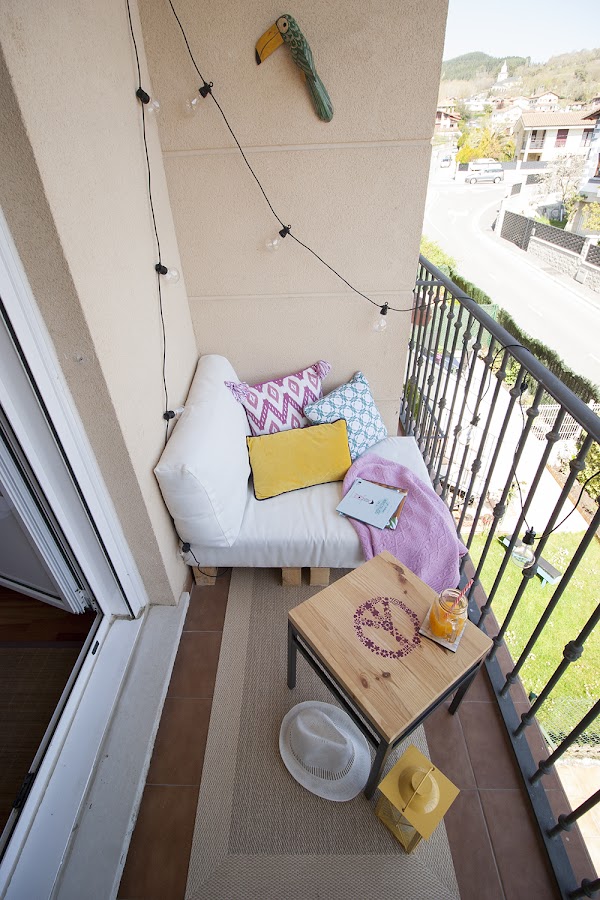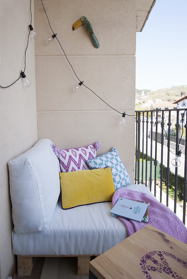 A todos nos gustaría tener una gran terraza en casa, pero la mayoría tenemos menos espacio del que nos gustaría. Por esto, os traemos esta idea del blog de nuestra compi Miren para decorar terrazas pequeñas. Decorar en familia nos enseña como ha decorado la terraza de la habitación de su hija, textiles bonitos, detalles que no deben faltar en cualquier terraza como la guirnalda de luces o un buen sofá o sillón (en este caso hecho de palets)