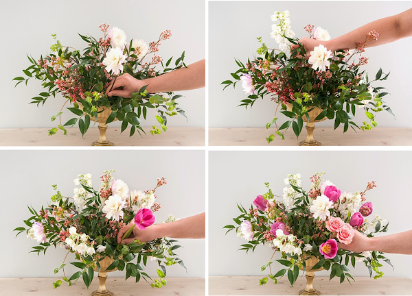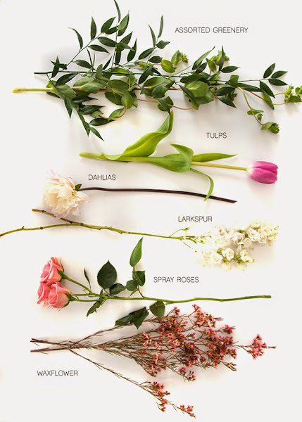 Ahora elegiremos las flores y ramas con las que realizaremos la composición. Para este arreglo floral se eligió primero unas ramas verdes, tulipanes rosas, dalias, boca de dragón, rosas y waxflower (esta ultima es un arbusto silvestre). Siempre puedes cambiar cualquiera de estas flores por unas de estilo similar.