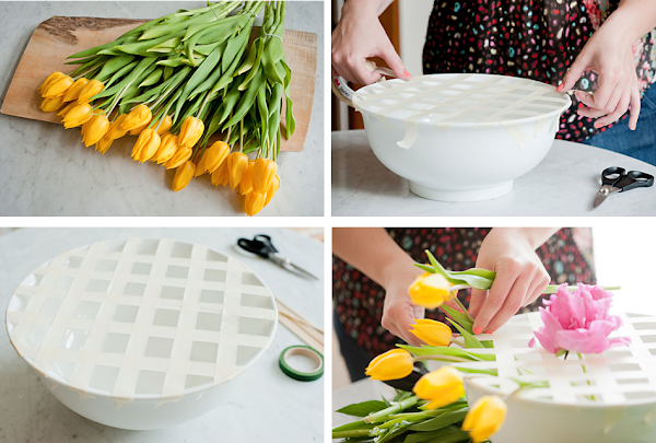 Ahora colocas los tulipanes amarillos en los cuadrados del borde del cuenco y los rododendros en el centro. ¿Este arreglo floral ha sido muy sencillo verdad?