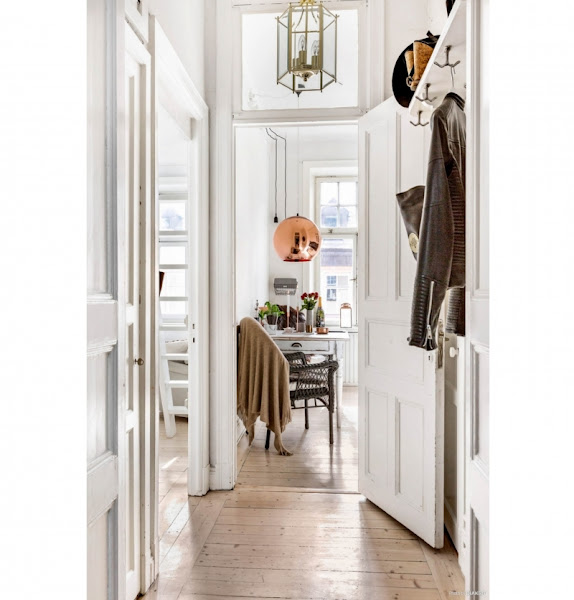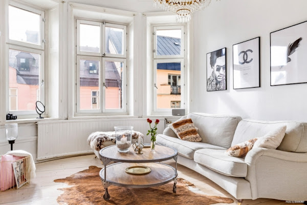 El día que Lucía y yo consigamos tener un "agujerito en la pared" como este de Estocolmo, sin duda voy a tomar nota de los trucos usados aquí. Por ejemplo el gran espejo de la sala de estar es un elemento que decora muy bien el salón, y mucho más con ese tamaño y ese marco dorado tan bonito, pero lo mejor que tiene este espejo es la amplitud que le da a la sala con lo pequeña que es. Otro truco que se usa mucho en los países nórdicos es la ausencia total de cortinas. Yo como tapicero jamás dejaré mi casa sin cortinas pero si hay que tomar nota en que es importante dejar pasar la luz al interior de la casa y no hay que recargar mucho las ventanas. Antiguamente cargábamos las ventanas de cortinas, visillos y bandó. Hoy día esto está muy anticuando y como podemos ver en este pequeño apartamento, cuanta más luz entre en la casa más bonita se ve, ya llegará la noche que todo lo oscurezca sin que podamos hacer nada.