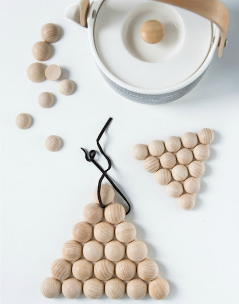 Regresamos a los salvamanteles, ahora en vez de utilizar listones de madera usamos una madera de balsa en forma de triángulo y encima pegamos bolitas de madera cortadas por la mitad. La idea es de sinnenrausch