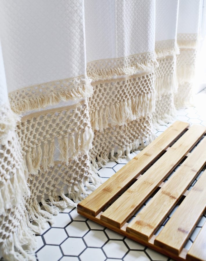 Lo más habitual es que un baño antiguo tenga bañera y cortinas. Esto no tiene por qué significar que nuestras cortinas de tela tengan que ser también antiguas. Podemos renovarlas con una bonita pasamanería o flecos, dándole un aire boho muy atractivo. El tutorial aquí.