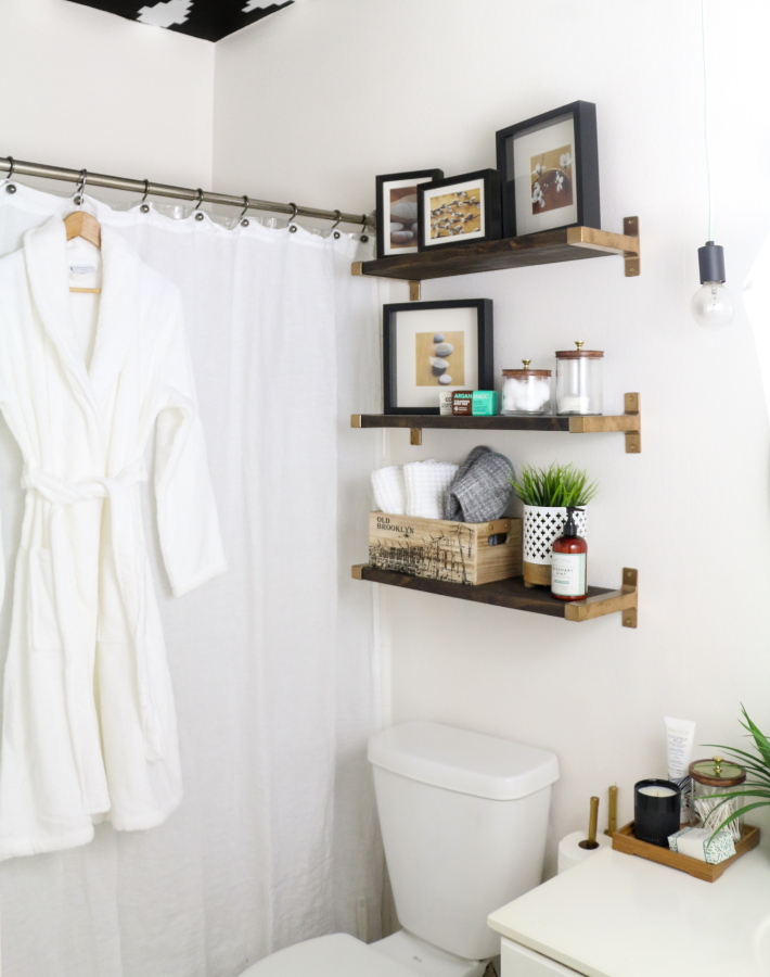 Si vuestro inodoro está más bien pasado de moda y no demasiado nuevo, lo ideal es que las miradas no se centren en él, sino desviarlas hacia un elemento decorativo. En esta ocasión el blog A beutiful Mess ha instalado unas baldas decorativas en madera oscura y metal sobre él.