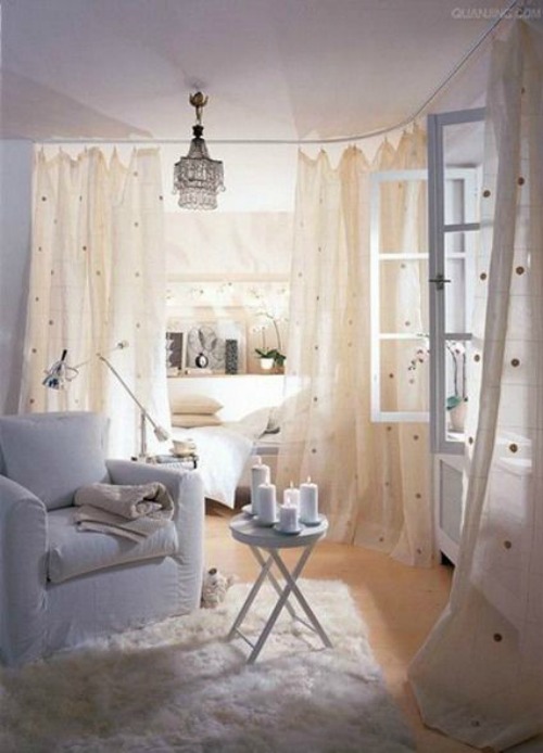 Las cortinas son otra ligera y versátil opción a la hora de separar ambientes en espacios pequeños. Eso sí, ten en cuenta siempre que a la hora de intentar aprovechar la luz natural de la estancia habrás de contar con tejidos translúcidos que dejen pasar la luz a través de ellos. Incluir en ellos colores claros será al mismo tiempo una buena decisión.