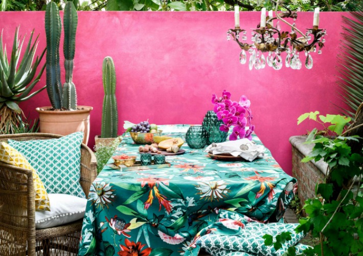 Nos ponemos en modo tropical para hacer un picnic en el jardín. Una inspiración atrevida con textiles de colores y estampados vibrantes. La colección se centra en los tejidos, cojines con diferentes estampados, manteles, caminos de mesa....coordinando el amarillo y verde intenso. Las frutas tropicales también están presente en jarrones y portavelas de vidrio con forma de piña.