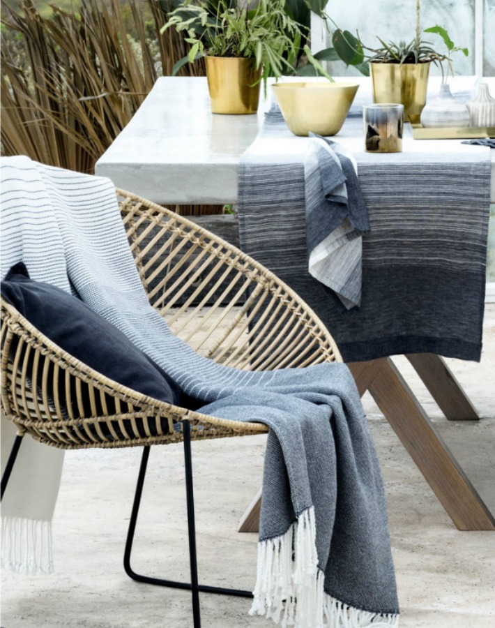 Terminamos con un picnic en la terraza, porche, patio..... Aquí se nos presenta una colección elegante y actual con textiles en algodón y lino en colores grises con estampados degradados. Incluso hay mantas para cuando refresca al anochecer. Para rematar el estilismo macetas y elementos decorativos en dorado y andracita.¿Que te parece?