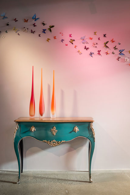 Y por último la cuarta propuesta de consola en verde esmeralda y sobre en dorado. Llena de frescura que evoca a los ricos colores de los muebles de estilo veneciano.