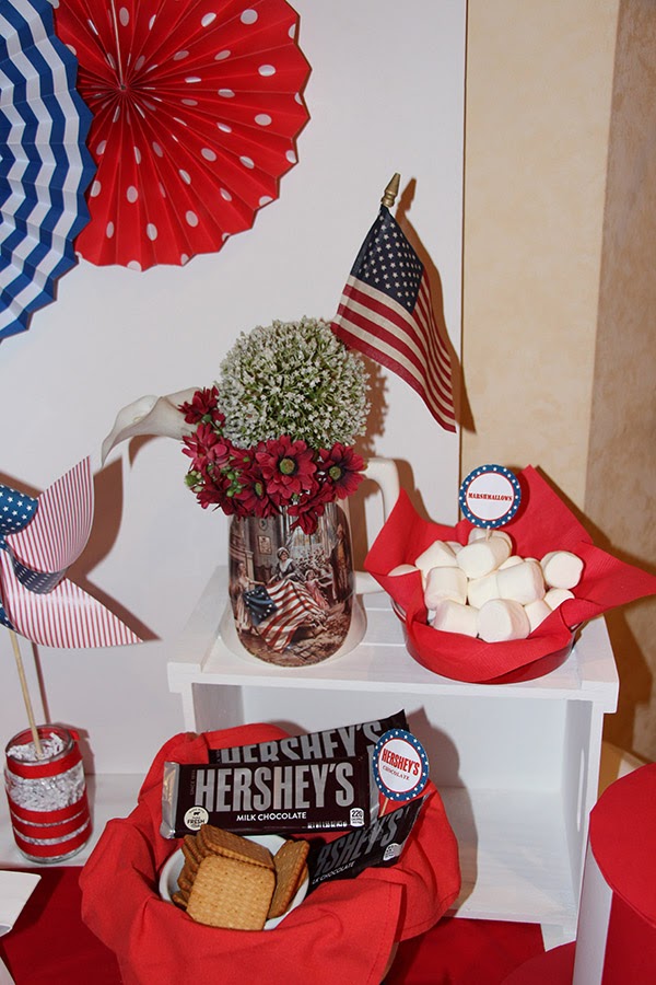 En una fiesta americana no podían faltar los smores (marshmallow tostado y una capa de chocolate entre dos trozos de galleta Graham), así que dispuse todo lo necesario para que cada uno hiciera los suyos, con galletas (no eran Graham porque fue imposible conseguirlas), chocolate Hersheys y marshmallows.