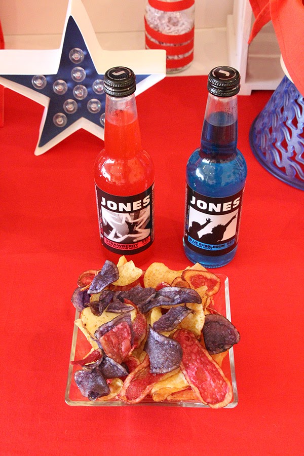 Para que se llevaran los dulces y las galletas tuneé unas bolsas azules y rojas, a las azules les enganché estrellitas blancas y a las rojas les añadí franjas blancas. Un DIY muy fácil que convirtió unas sencillas bolsas en unas totalmente integradas con la temática de la fiesta.