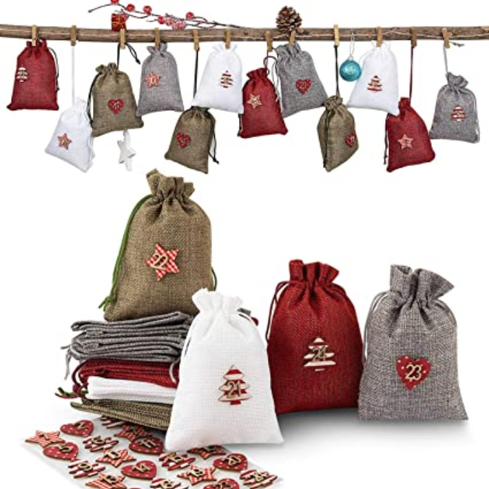 QILICZ - 24 bolsitas de yute para calendario de adviento para rellenar, regalo para invitados, bolsa de yute, bolsa de tela en 4 colores.