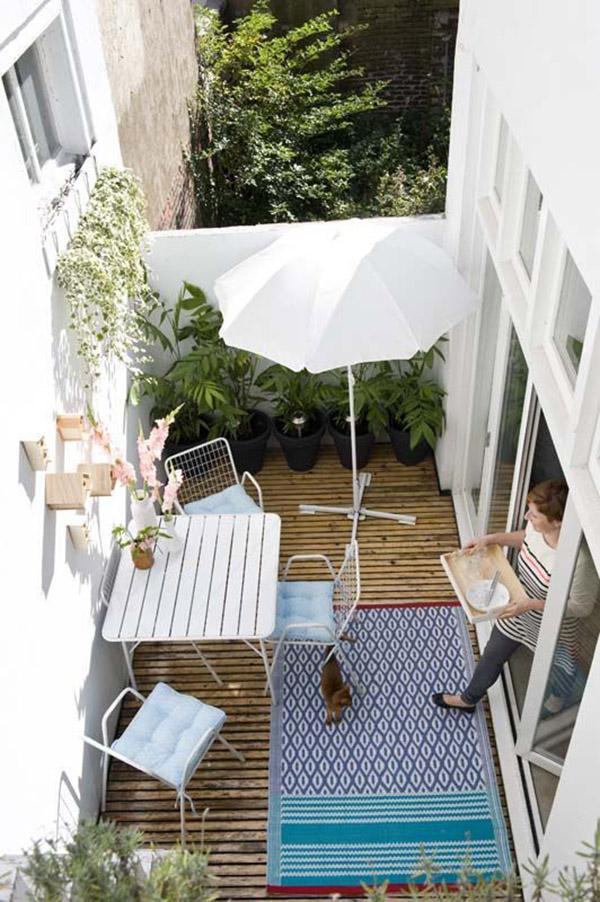 Puedes elegir pequeños árboles en macetas, hiedra verde, etc. Hay muchas plantas con las que puedes crear pantallas vegetales para dotar de privacidad a tu balcón. Otra idea para aumentar la privacidad del espacio y resguardarte en lo posible de miradas indiscretas es colocar una sombrilla. Además de protección solar te dará intimidad.