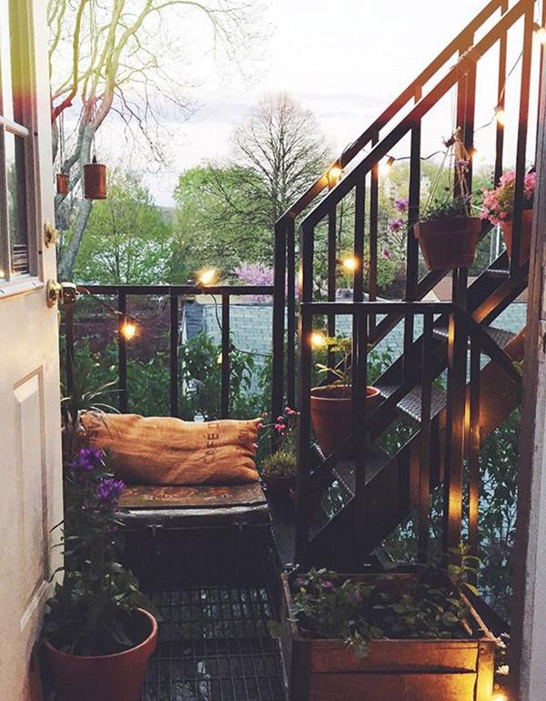 Iluminar los balcones pequeños con velas al caer la noche es un detalle muy especial, que hace el espacio mucho más agradable y acogedor. Si te gusta la idea pero lo de poner velas te parece poco adecuado, puedes poner pequeñas luces led que simulen la luz de las velas. Todo son ventajas: consumen poco, son más seguras y no se apagan con la brisa de verano.