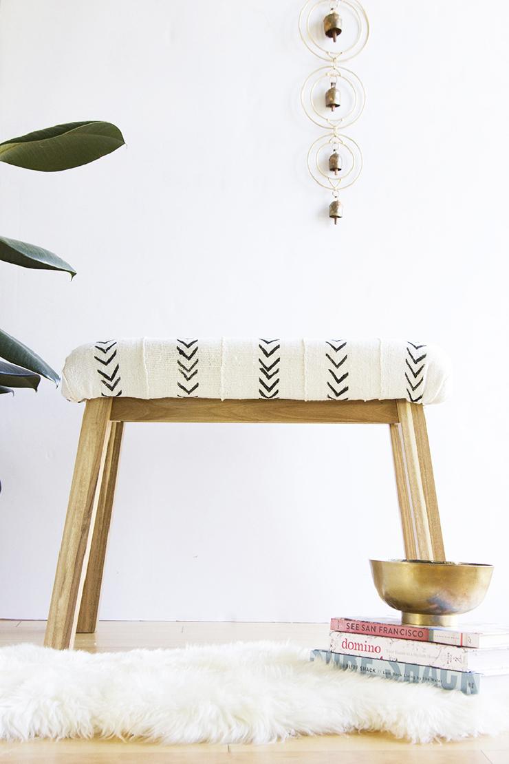 Puedes convertir un simple banco en uno más personal. En este caso es un banco de Ikea al que se le ha puesto una tela de estilo étnico. Puedes ver el tutorial completo aquí.