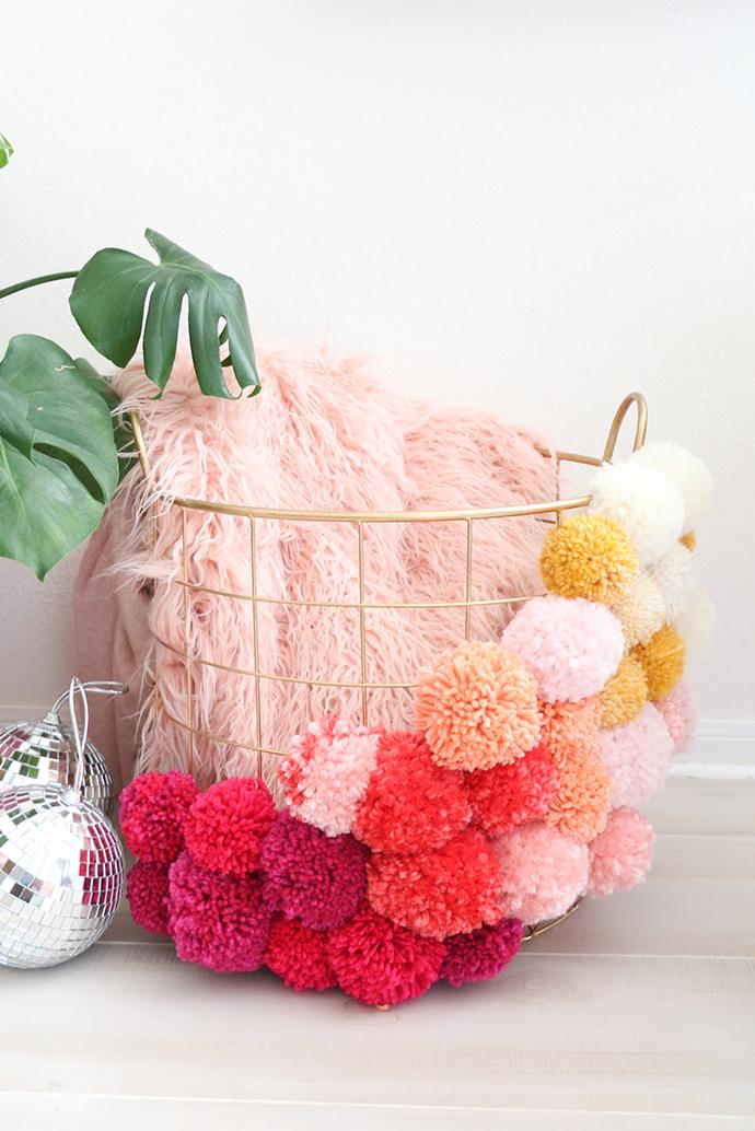 Los pompones siempre son una buena idea para decorar cualquier objeto. En este caso se ha customizado un cesto metalico. Puedes ver el tutorial aquí.