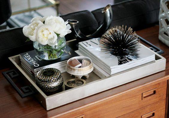 Existen diferentes formas, colores y texturas para este tipo de bandejas, como metálicas, de madera, piel, vidrio, etc, busca una que se acomode a tus necesidades.
