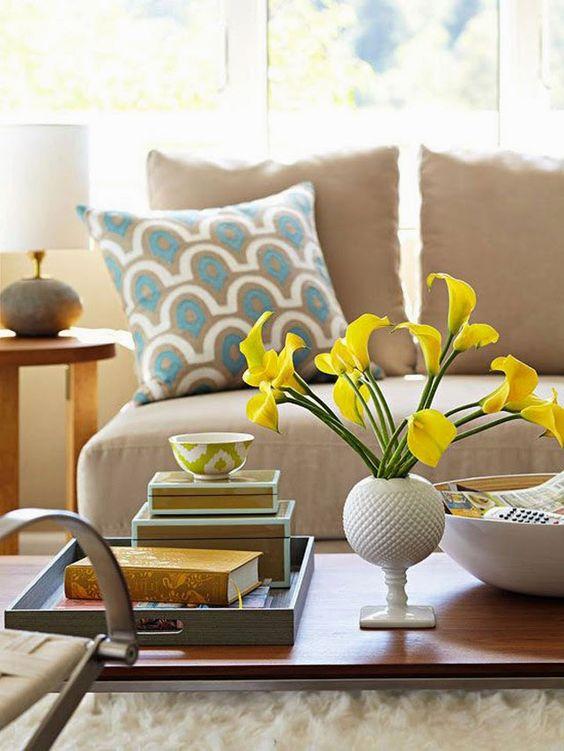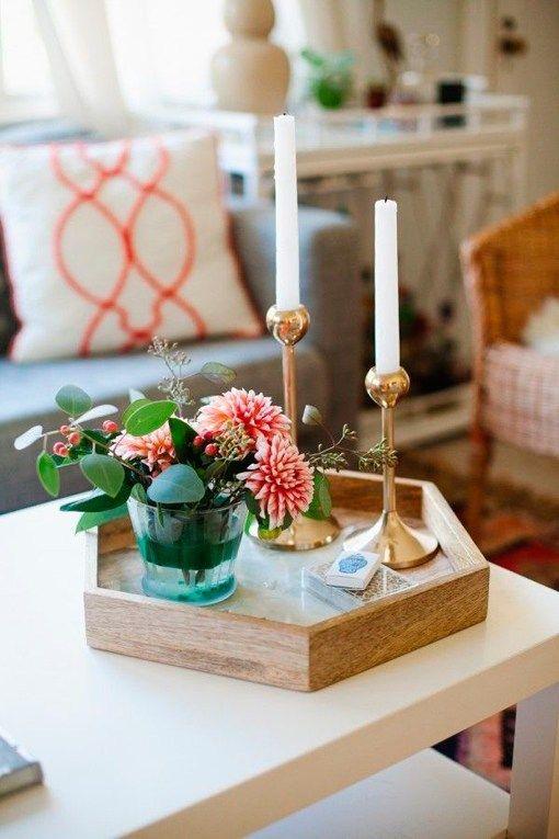 Un arreglo de flores funciona muy bien en una sala, si es natural sería lo ideal, unas flores como rosas, orquídeas o otra flor que te agrade, sobre un jarrón funcionaría perfecto, ya que convertirá tu sala en un lugar agradable y acogedor para pasar el rato.Además de las flores , una muy buena idea de decorar tu mesa de centro es añadiendo pequeños detalles naturales como ramas, piedras decorativas, hojas. Si no eres de las personas que tienen demasiado tiempo en cuidar flores puedes utilizar flores artificiales o algunos objetos que tenga la ilusión de ser flores, existen muchos adornos en el mercado muy parecidos a hojas o flores.
