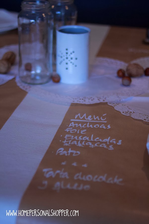 Para terminar os muestro mi mesa de Navidad del año pasado, sobre un mantel blanco utilice, unos caminos de mesa que eran PAPEL DE REGALO, kraft, donde con un rotulador puse los nombres de los comensales y el menú de ese día, a lo largo de la mesa, con BLONDAS de papel, hice un gran camino blanco para que así resaltará la decoración de la mesa, realizada con nueces, avellanas, manzanas y tarros reciclados.