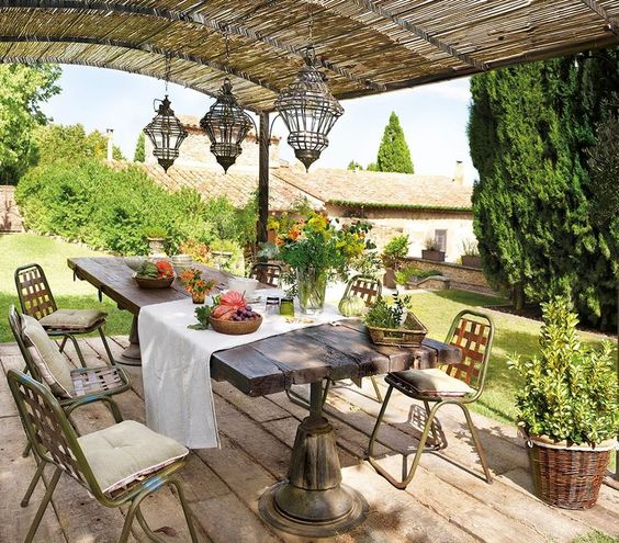 En la terrazas, porches, es recomendable crear "sombras vegetales" con plantas: unas plantas arbustivas de hoja caduca, emparradas en la terraza o el balcón orientado al sur o al oeste, pueden ser buenos aliados. En verano cuando están repletos de hojas, ayudan a frenar la entrada del sol en casa y su sombra baja la temperatura algunos grados; en otoño-invierno, al caer las hojas, permite la entrada del sol que calienta.