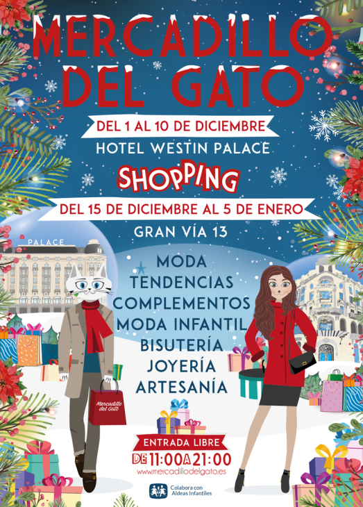 El Mercadillo del Gato,es ya todo un clásico navideño en Madrid. Se trata de unmercadillo Pop Up de donde podrás encontrar una gran selección de artesanía,ropa infantil,joyería, bisutería...Un Mercadillo con buen rollo que no te debes perder.