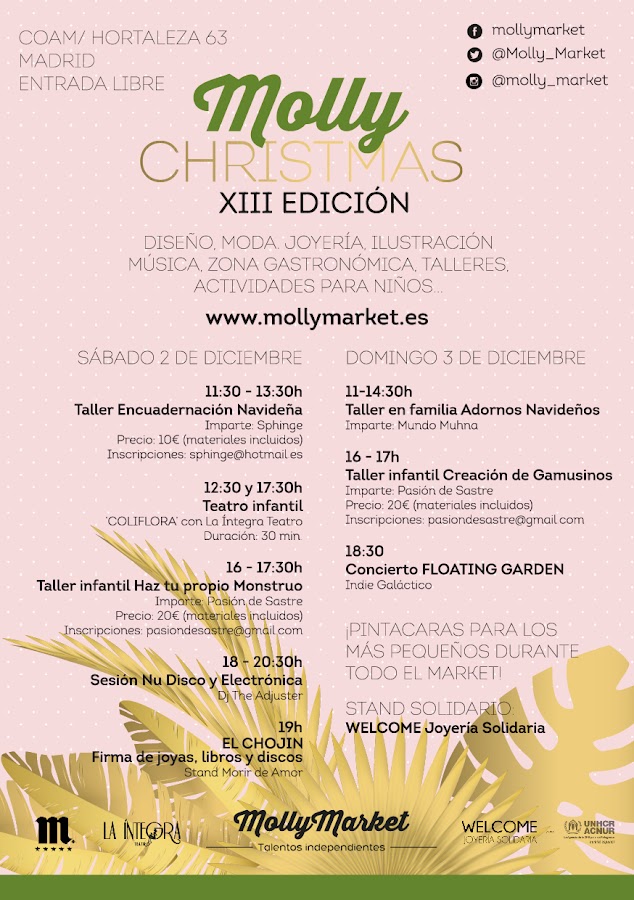 5.MOLLY CHRISTMAS MARKETMolly Christmas Market es un mercadillo con un montón de actividades y talleres para niños y con un gran variedad de creadores independientes. En este Mercadillo podremos ver tendencias nuevas y novedosas de diseño,arte,moda y gastronomía.También hay conciertos para disfrutar de buena música durante nuestra estancia allí.Está situado en el COAM Colegio de Arquitectos de Madrid).