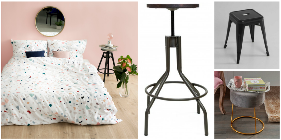 Si se puede poner una silla como mesita, también se puede hacer lo mismo con un taburete y el resultado será mucho más discreto. Aquí puedes ver un ejemplo de una banqueta de metal a la que le han añadido un segundo nivel con un estante de madera. Es perfecto para casos en los que falta espacio para una mesilla convencional.¡Escoge el diseño que más te gusta! Si se queda pequeño en cuanto a superficie, puedes añadirle una bandeja encima. Asegúrate de fijarla bien con adhesivo o unos tornillos para que no haya peligro de caída.