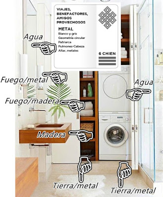 Si colocamos el Mapa Bagua sobre este plano podemos ver que el lavadero se localiza en el cuadrante inferior derecho cuya correspondencia es: Ayudas y viajes.Esto nos facilita a la hora de equilibrar y armonizar el espacio ya que conocemos el "Elemento" que rige este cuadrante Metal