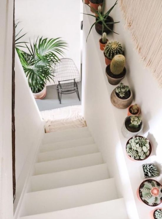 La escalera no puede ser menos que cualquier otro lugar de nuestra casa, tenga el estilo que tenga, siempre le vendrá bien acompañarlas con esa energía viva que transportan las plantas, aportando un plus de beneficios para mantener el hogar saludable.
