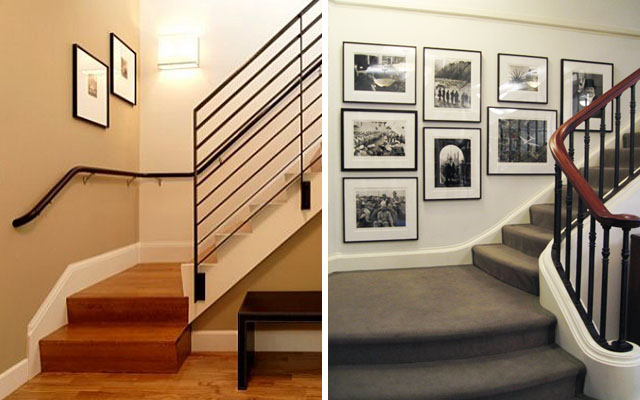 principio de la escalera debe ir el mayor número de cuadros; se irá disminuyendo conforme subimos la escalera. Puedes aprovechar para contar una historia a través de las imágenes dando un plus de personalidad a la escalera.