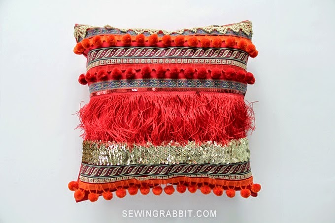 Este cojín es perfecto para aportar un aire étnico a una habitación. En el blog Acotío decó te muestran como realizarlo, además incluso puedes reciclar trozos de pasamanerías, pompones, flecos, puntillas..... que tengas en el costurero.