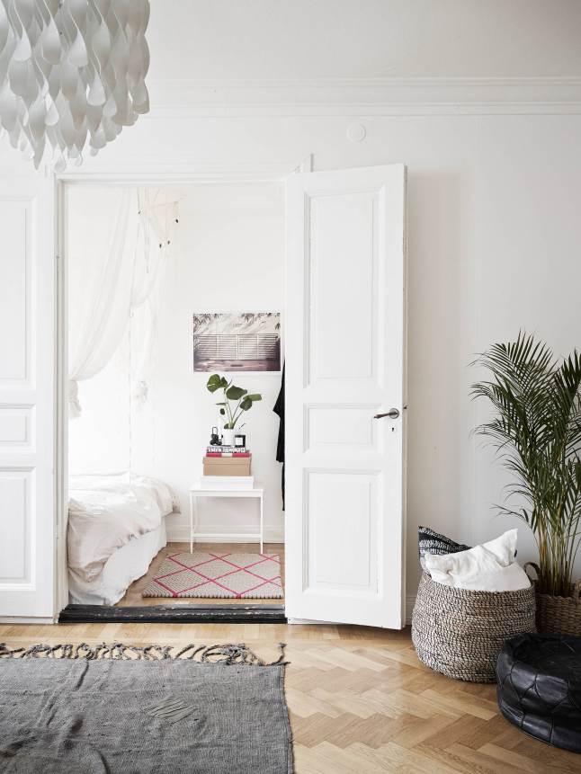 Su interior se ha amueblado con piezas escogidas, mobiliario de diseño y vintage, todos ellos con el blanco y el negro como absolutos protagonistas, junto con la ,madera (el suelo en espiga me parece precioso) y algún toque de tonos empolvados en los textiles.