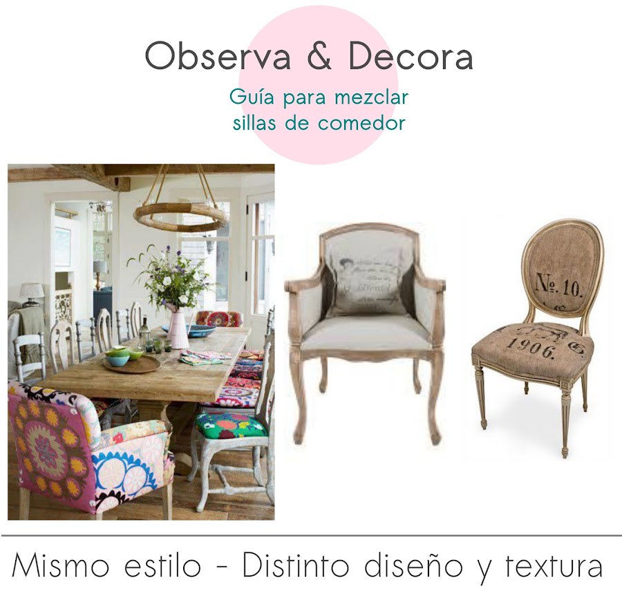 Y por último te propongo esta mezcla de texturas en sillas del mismo estilo pero de distinta forma. Así, puedes jugar tanto con la textura y los colores del tapizado y colocar sillas con reposabrazos en los extremos y sin ellos a los lados.
