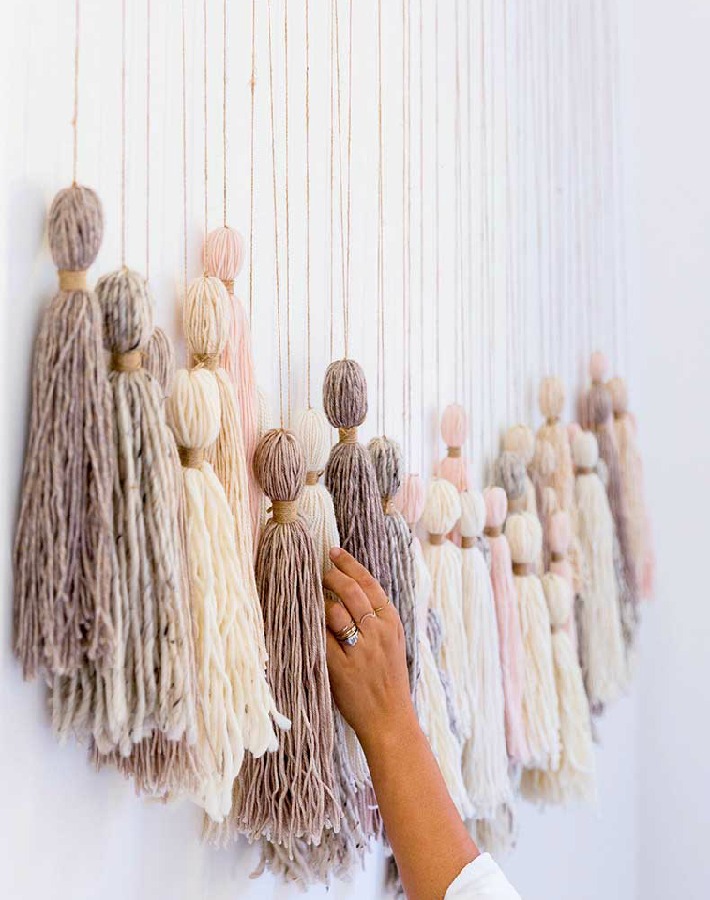 No me puede parecer más original y preciosa esta idea de crear un mural con colgantes de borlas. Lo primero que tendrás que hacer es comprar lana de diferentes colores que coordinen entre sí. En el mural que ves en la imagen obra de Cut y paste han elegido lana de colores pasteles en la gama del rosa. Una vez tienes hechas las borlas las cuelgas a diferentes alturas de una barra.