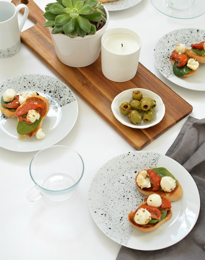 Este diy lo vi primero en un blog que sigo habitualmente Una pizca de hogar y no me puede gustar más. Se trata de cambiar y dar vida y dinamismo a un sencilla vajilla blanca, si te animas el paso a paso lo puedes encontrar en Burkatron