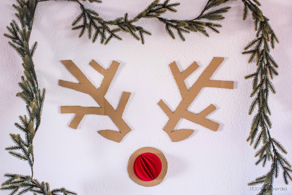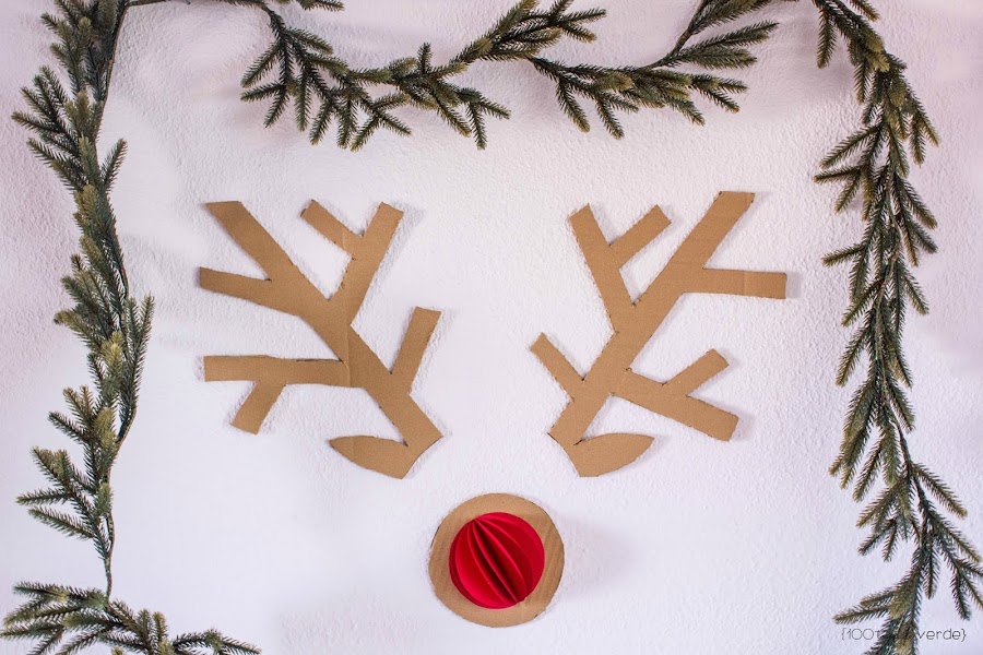 No he hecho tutorial porque es muy muy sencillito. Basta con dibujar la silueta de los cuernos y las orejitas sobre cartón y recortarlos. Para hacer su característica nariz roja he usado la misma técnica que utilicé para hacer las calabazas de Halloween (pincha aquí para ver el tutorial). Y para pegarlo en la pared he empleado unos trocitos de cinta de doble cara.
