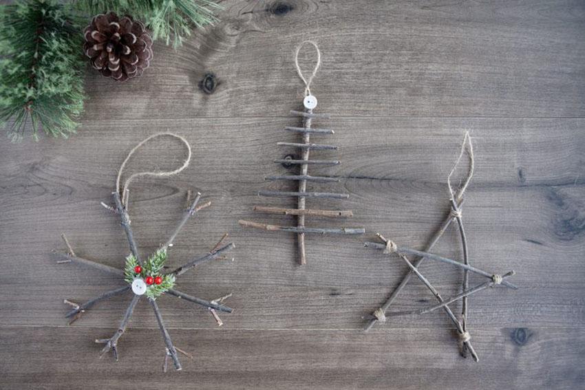 Fuente: Simple as That Sustituye las guirnaldas doradas por cintas de arpillera de color marrón. Cambia las bolas de cristal y metal brillante por piñas pintadas o por adornos rústicos hechos con palitos.