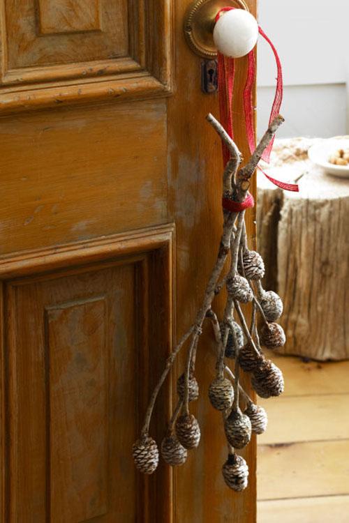 Fuente: Country Living Estos adornos tan sencillos y especiales son, además, muy fáciles de hacer. Tan solo tienes que buscar unas ramas con pequeñas piñas y atarlas con una cinta roja.