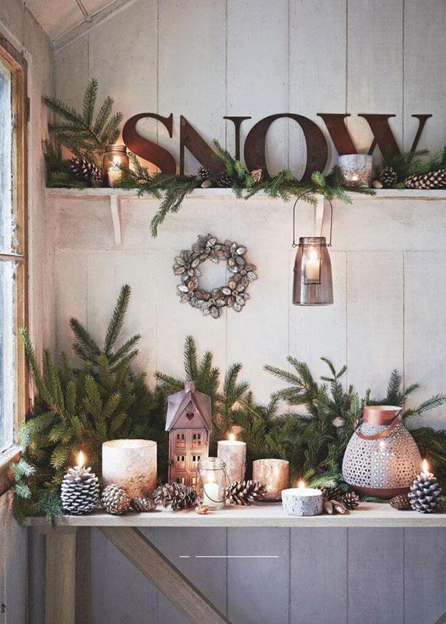 Fuente: Homebcn No hay guirnalda más natural que unas buenas ramas de hojas de abeto. Colócalas en una repisa acompañadas de unas piñas de diferentes tamaños y unas velas. Tendrás una decoración navideña absolutamente genial.
