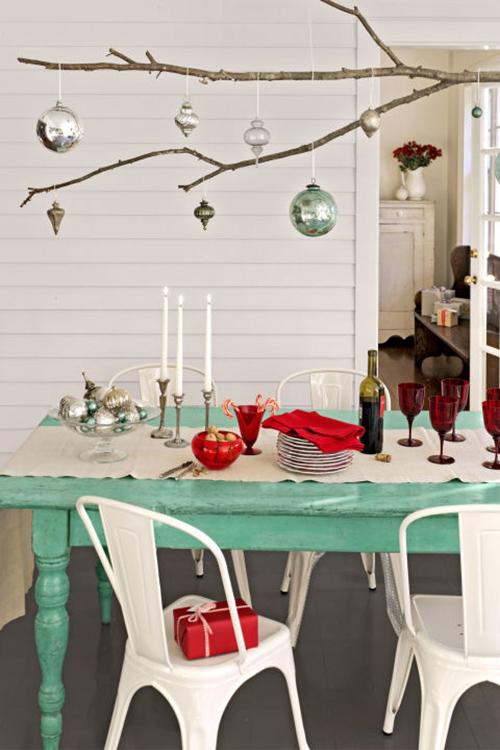 Fuente: Country Living Otra idea de Navidad rústica que queda genial en la mesa de celebración es sujetar una gran rama de forma que quede por encima de los comensales y colgar algunos adornos de ella, como puedes ver en la foto.