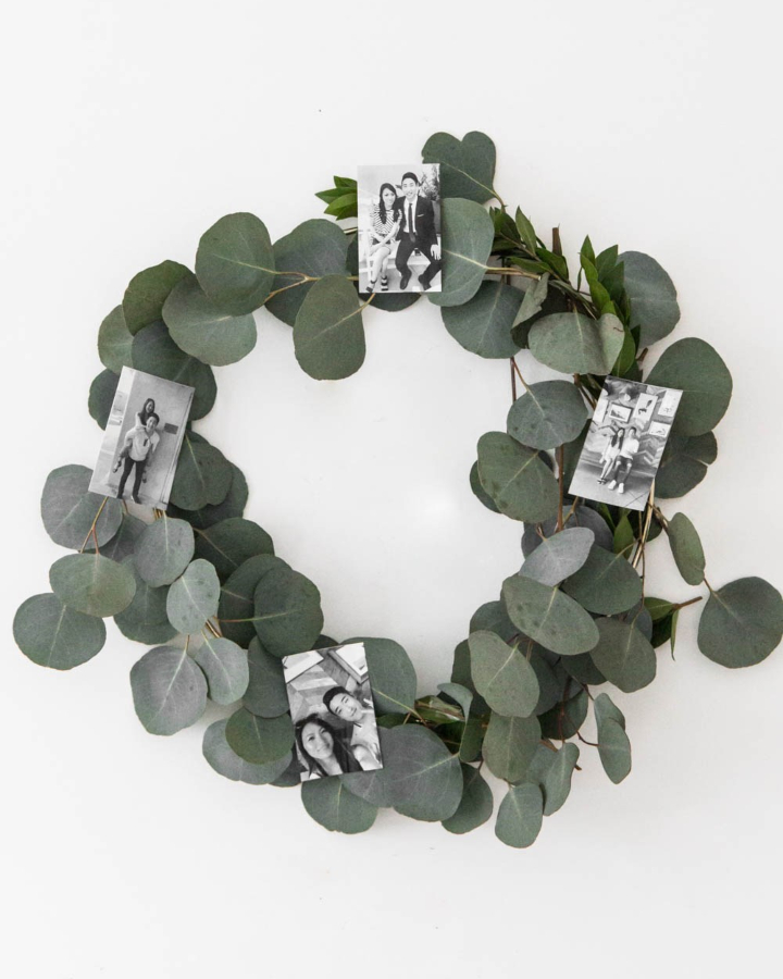 Podemos realizar una corona con rama de eucalipto y luego imprimir unas bonitas fotos para colocarlas alrededor de ella. Un regalo perfecto para un familiar o amigo. La idea es de The beauty dojo