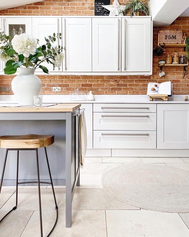 Las cocinas con paredes de ladrillo parecen haber llegado para quedarse. Incluso los frentes de cocina se revisten de ladrillo visto, que viene a sustituir al azulejo de metro.Para combinar con estos revestimientos inusuales en cocinas (hasta ahora), vemos muchos muebles de cocina con puertas molduradas que rememoran diseños rústicos aunque, ahora, renovados.