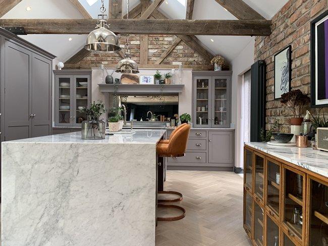 Las cocinas con encimeras de mármol veteado son también tendencia. Las grandes islas de cocina con faldones laterales en este material vuelven a reivindicar la piedra natural en las cocinas.