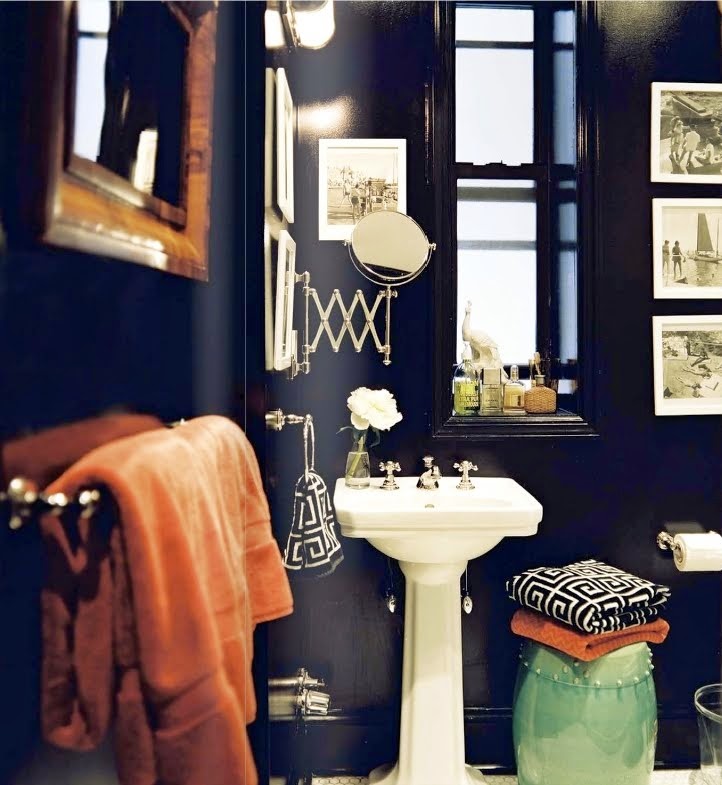 3. Decorar con objetos ajenos al baño: por ejemplo, una lámpara de ensueño, cuadros con arte, maniquíes, pequeñas vitrinas, espejos lujosos, pequeños sillones, sillas vintage, etc...darán un toque de personalidad, humor y chic al baño, al tiempo que lo harán mucho mas acogedor, y borrarán de un plumazo esa carga tan "aséptica" que tienen algunos aseos.